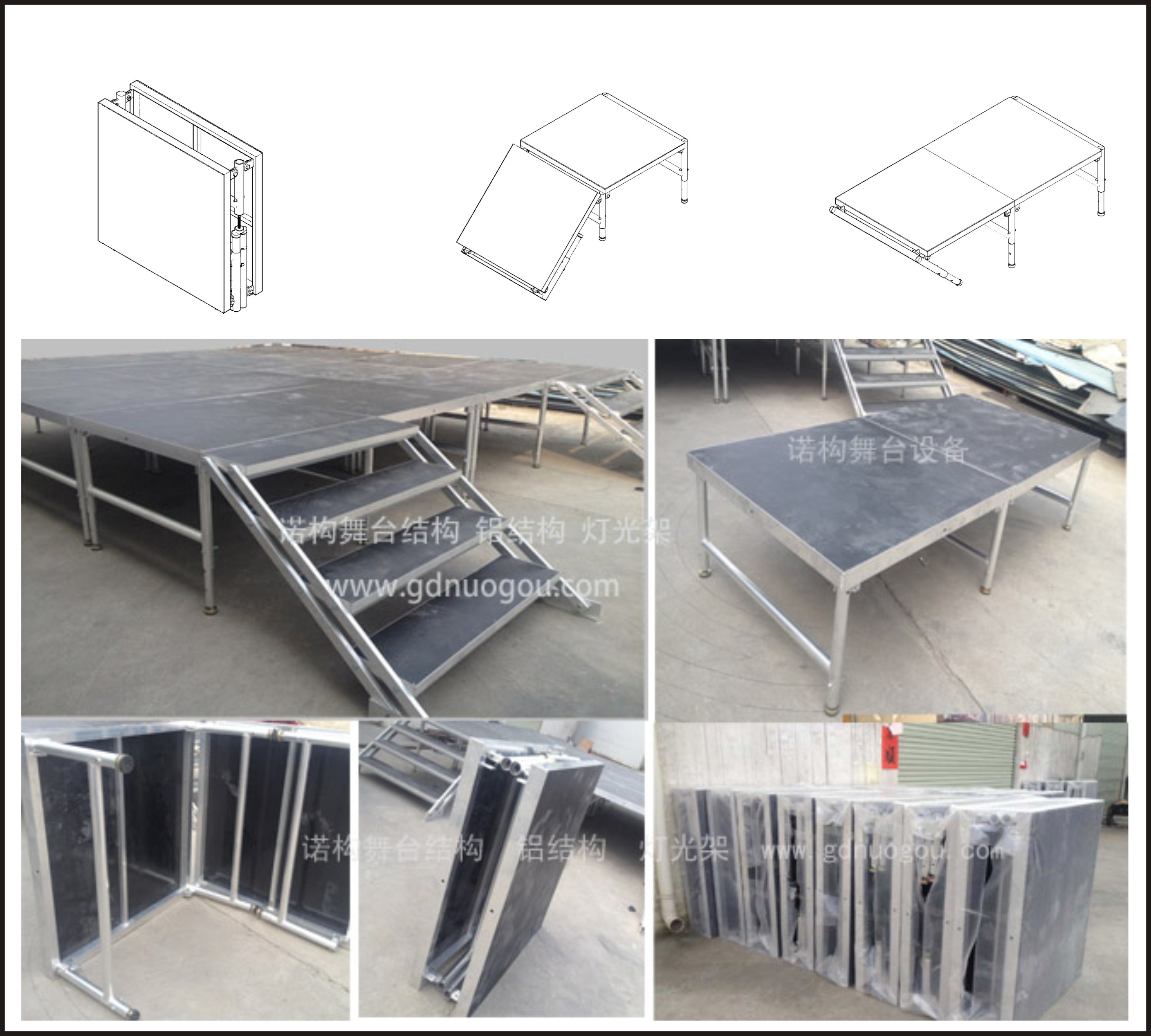 最新鋁合金折疊舞臺(tái)在酒店舞臺(tái)的基礎(chǔ)上研發(fā)而成,折疊后為一個(gè)四方整體方便運(yùn)輸及存放,整個(gè)舞臺(tái)除了舞臺(tái)板外采用全鋁合金制作,全插銷結(jié)構(gòu),結(jié)構(gòu)輕便,從打開到安裝完畢一張舞臺(tái)不到1分鐘,實(shí)現(xiàn)舞臺(tái)搭建的一個(gè)突破,現(xiàn)有兩個(gè)舞臺(tái)框可選1*2M*H0.4-0.6M ,1.22*2.44M*0.6-1.0M.
